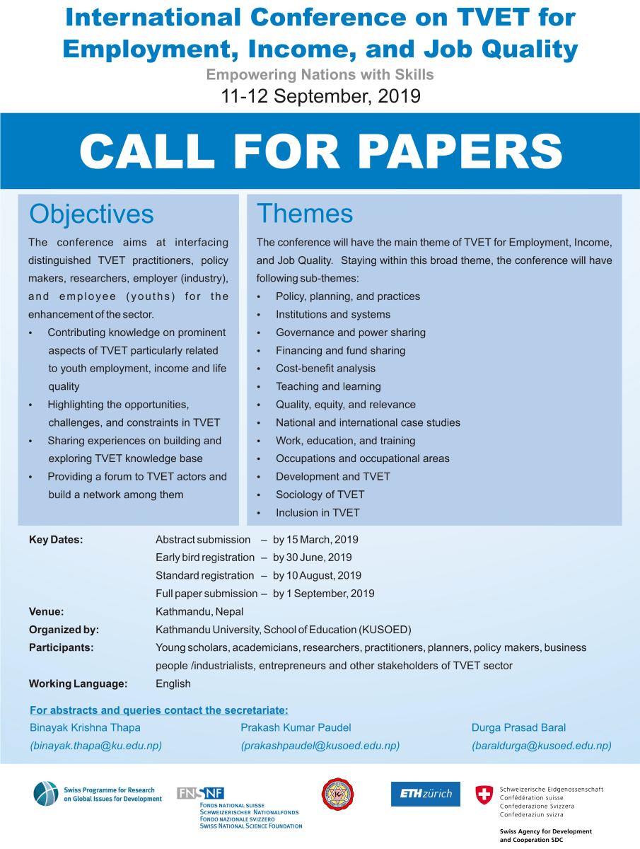 Kathmandu University is organizing an international conference on TVET with the main theme TVET for Employment, Income, and Job Quality.